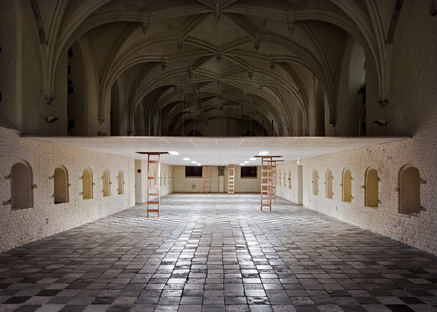Taken from the Book of Isaiah (1:8), the title A lodge in a garden of cucumbers refered to a refuge from noise, a place of shelter where reflection is possible, a kind of inner chamber. At De Vleeshal, this archaic inner chamber was the starting point for a monumental installation in which the artist combined architectural features with references to a Pietistic idiom that is sometimes impenetrable to the uninitiated. Labeur’s full-size installation in the Gothic, almost church-like Vleeshal invited visitors to play with various linguistic interpretations and engaged in an exchange between images and words.