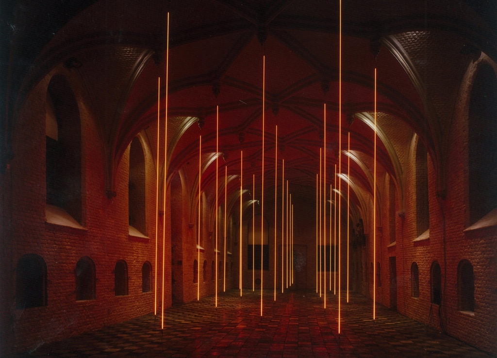 Jan van Munster's twelfth heating installation is set up in the Middelburg Vleeshal. It is a preliminary conclusion of a series of projects in which he raises an image in space with glowing wires. That is an aspect of his work in which energy is a core concept. The 80's have enabled one to see energy and at the same time to wonder how much can be achieved in a space with little resources.