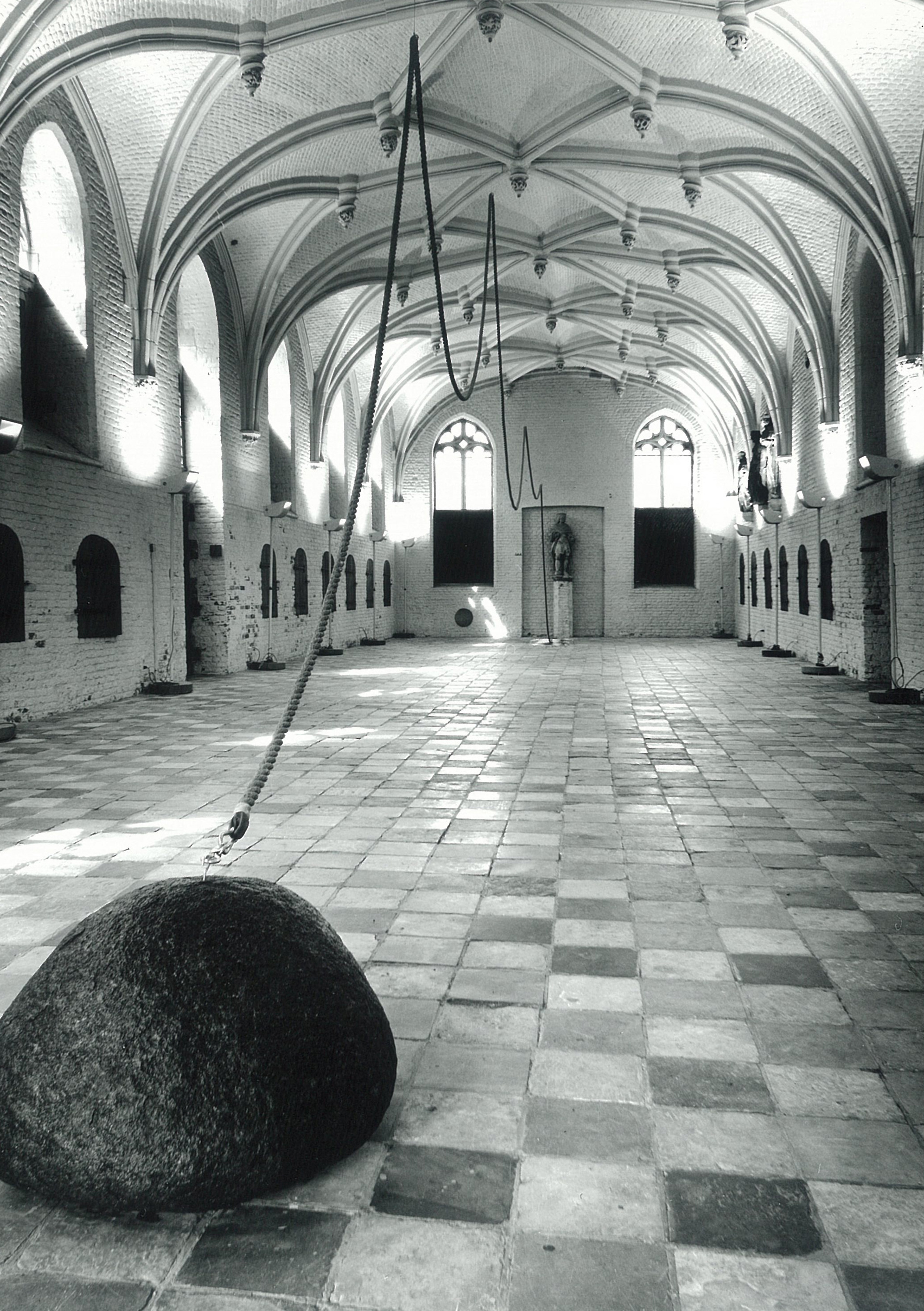 Een lang slingerend koord, dat aan het plafond is bevestigd, verbindt een zwaar granietblok met een levensgrote foto van de kunstenaar. De sculptuur ontplooit zich niet vanuit een centrum, zoals in de klassieke beeldhouwkunst, maar in tijd en ruimte langs de op en neer gaande lijn van het touw, vanaf de steen tot aan de foto plat op de grond. Arrangement en maat liggen niet vast, zij zijn afhankelijk van de plaats waar de sculptuur is opgesteld. De manier waarop het werk in 1982 in het Provinciaal Museum Hasselt en in De Vleeshal in Middelburg is geïnstalleerd, kan als maatgevend worden beschouwd. De foto van de kunstenaar van de rug af gezien is dezelfde als in de verschillende varianten van Jump (1981). De bijenwas rondom de foto verwijst naar een citaat uit de Metamorphoses van Ovidius (“flavam modo pollice ceram/ mollibat…” VIII, 231-2). Het motief van het aan een steenblok verankerde touw, dat de vlucht verhindert, komt voor de collage L’Uomo Volante (1975-79). Het Icarus-motief komt onder verschillende gedaanten voor in het werk van Boezem. Uit enkele ideeënschetsen van het werk (Archief Boezem) blijkt dat er, in plaats van het dikke manillatouw, oorspronkelijk gedacht is aan een 4 cm breed wit lint, dat als een grafiek door de ruimte gaat. Het werk is geïnspireerd door de bekende foto Saute dans le vide (1960) van een duikvlucht door Yves Klein.